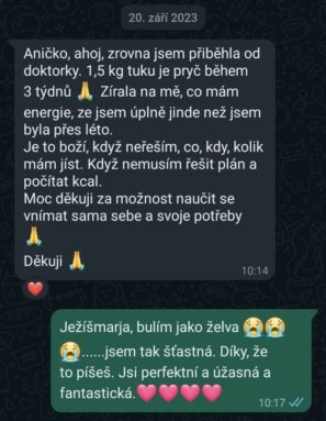 "Nemám, žádné chutě na sladké, zhubla jsem asi 10 kilo, zmizela mi dlouholetá zácpa a dokonce jsem začala vysazovat antidepresiva. Takhle se budu stravovat klidně až do konce života. Kromě toho, že jsem zhubla, jsi mi i zachránila manželství."