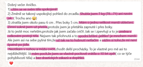 "Úplně se mi mění pohled na sebe, na moje tělo i na moje jídlo. V pase mám dole asi 6 cm a začaly mi padat kalhoty - už teď se těším na léto. A opravdu se mi daří dávat sama sebe na první místo. Věci, které se mi v životě dějí, už pro mě nejsou až tak složitý."